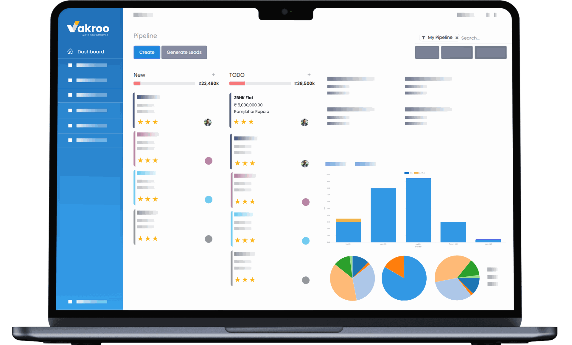 Vakroo is a powerful and user-friendly CRM designed to help businesses manage leads, improve sales, and enhance customer relationships. It processes, saves time, and provides real-time insights for better decision-making.